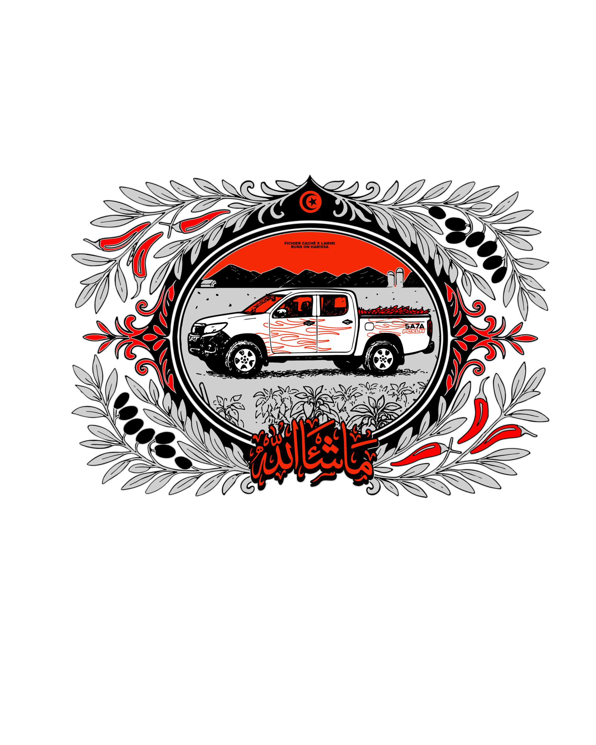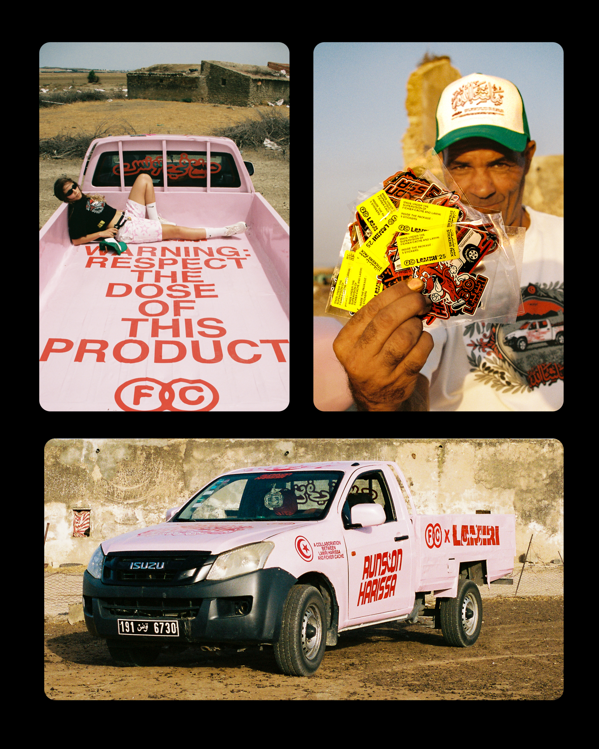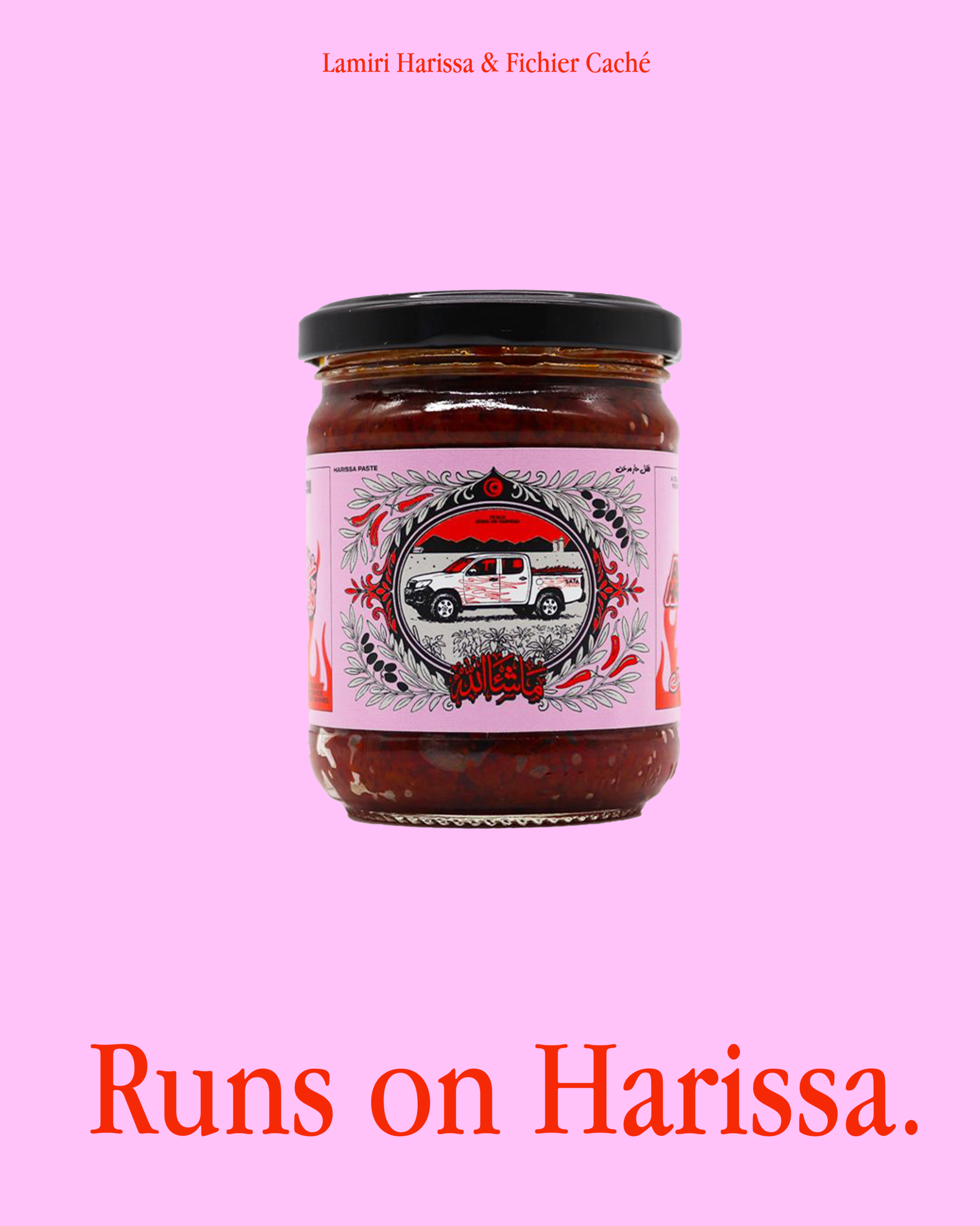 The project began with a simple question: how can we translate the essence of Harissa, its spice, its labor, its cultural weight, into design? with Fichier Caché and Lamiri Harissa we explored Tunisia's visual and emotional relationship with this staple, tracing its journey from local farms to kitchen tables. The truck became our central symbol, that humble machine connecting land, labor, and culture. From there, we developed the full creative direction: concept, art direction, branding, merchandise, and production. We transformed the truck into a moving icon, a bold pink vehicle, fully branded from top to bottom, carrying Harissa cans, stickers, air fresheners, and t-shirts. For marketing, we brought the concept to life, literally. We built the real truck, turned it into a mobile installation, and shot the campaign across Tunisia. Even after the activation, the truck remained on the road, still branded, offering ongoing visibility long after the campaign ended.